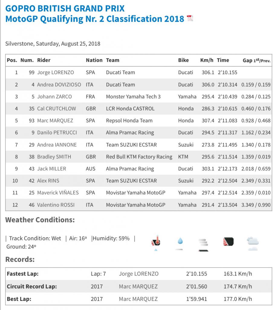 Posisi kedua disabet rekan satu timnya, Andrea Dovizioso. Melengkapi baris pertama ada pebalap Yamaha Tech 3 Johan Zarco.