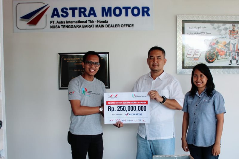 Tak hanya lampu, Wahana juga menyerahkan bantuan uang tunai melalui kantor perwakilan Honda Sales Operation (HSO) Mataram senilai Rp 250 juta. Bantuan yang di terima langsung oleh Region Head HSO Mataram, Wahyudi Saputra diharapkan dapat tersalurkan untuk korban bencana secara tepat, karena mengetahui beragam kondisi korban di lokasi.