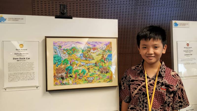 DAPURPACU – Damion Deven, perwakilan pemenang Toyota Dream Car Art Contest (TDCAC) asal Indonesia, berhasil meraih penghargaan tertinggi Gold Medal di ajang lomba gambar internasional TDCAC di Jepang, Kamis (29/8) lalu.