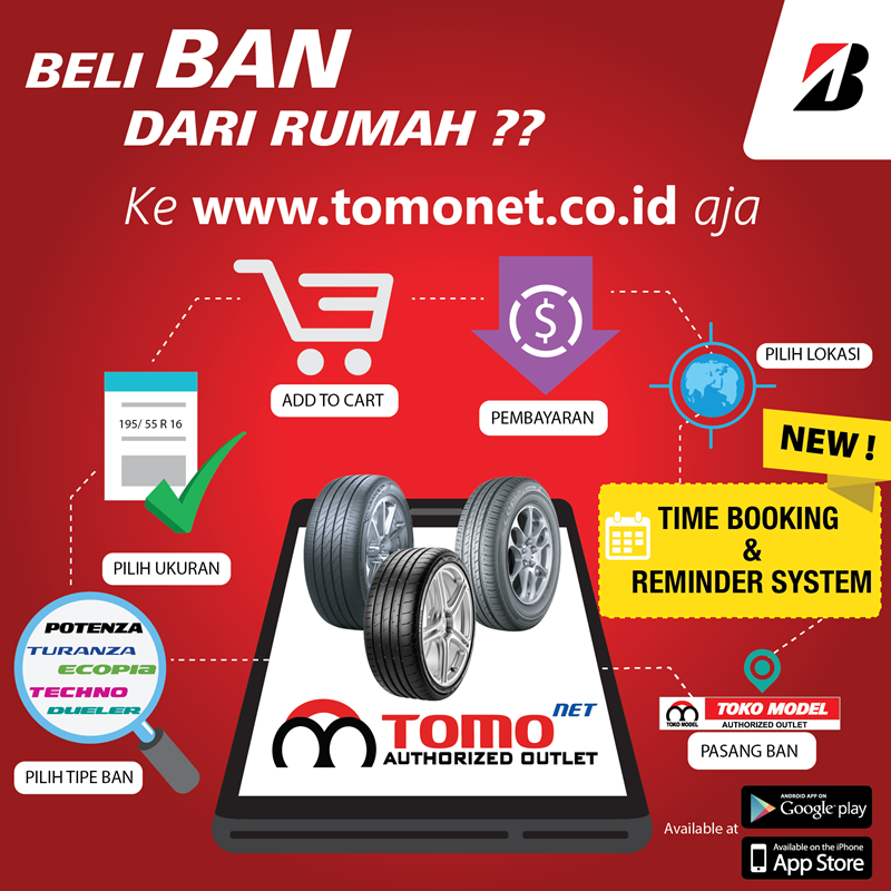 TOMOnet dapat diakses oleh pelanggan melalui website atau mengunduh aplikasi melalui Google Play Store and Apple App Store. Menu pemilihan jadwal pasang, untuk saat ini hanya tersedia di Toko Model (TOMO) Bridgestone tertentu. [dp/MTH]