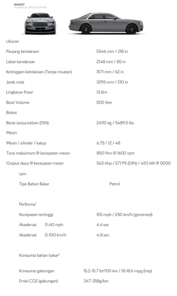 Dilengkapi dengan mesin V12 twin-turbo 6,75 liter, Ghost terbaru ini menghasilkan tenaga 571 PS dan 850 Nm. Sedangkan untuk pintu di model terbaru ini sekarang terbuka dan tertutup secara elektrik, komponen interior dirancang ke dalam frekuensi resonansi tertentu untuk menciptakan rasa ketenangan, di exterior Grill Pantheon yang menyala secara misterius menerangi ikonografi Rolls-Royce Illuminated Fascia yang menampilkan papan nama Ghost yang dikelilingi lebih dari 850 bintang.