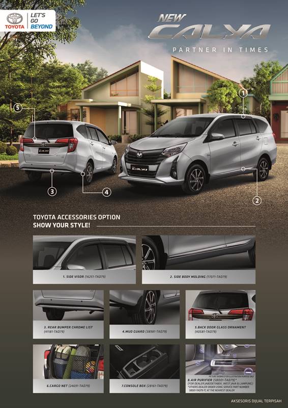 Khusus untuk pelanggan Calya, tersedia 8 pilihan mulai dari Side Visor, Console Box, Side Body Moulding, Rear Bumper Chrome List, Cargo Net, Mud Guard, Rear Back Door Glass Ornament dan fitur kesehatan Air Purifier.