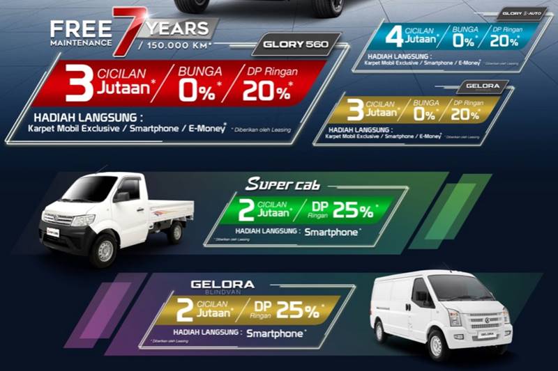 Untuk Glory i-Auto misalnya. Tiap pembelian medium SUV dengan banderol Rp329,699 juta ini, ditawarkan bunga 0%, cicilan rendah mulai dari Rp4 jutaan, atau DP rendah. Penawaran ini juga berlaku untuk Glory 580, yang dibanderol Rp252,9 juta.