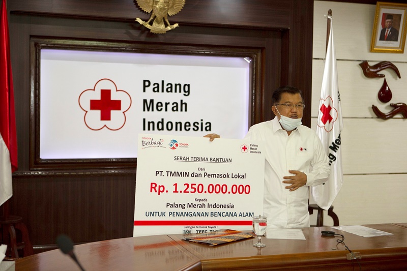 Bantuan diserahkan Presiden Direktur PT TMMIN Warih Andang Tjahjono kepada Ketua Umum Palang Merah Indonesia Jusuf Kalla secara virtual di lokasi masing-masing.