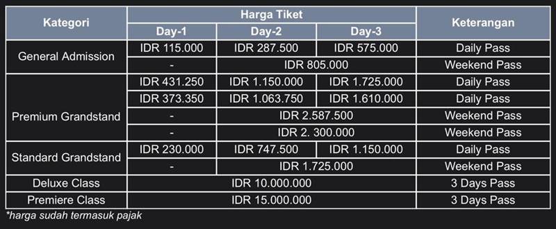 Sementara untuk penjualan tiket kategori Standard Grandstand dan General Admission akan berlangsung pada 11 Januari, melalui platform yang sama. Pembelian secara online akan berlangsung hingga 17 Maret.