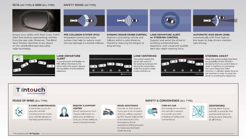 Fitur ini dilengkapi dengan Road Assistance, tombol SOS ketika pelanggan mengalami kecelakaan, dan dapat langsung menghubungkan pelanggan dengan call center Toyota untuk diarahkan ke penyedian Emergency Road Assistance (ERA) untuk mendapatan bantuan yang lebih cepat.