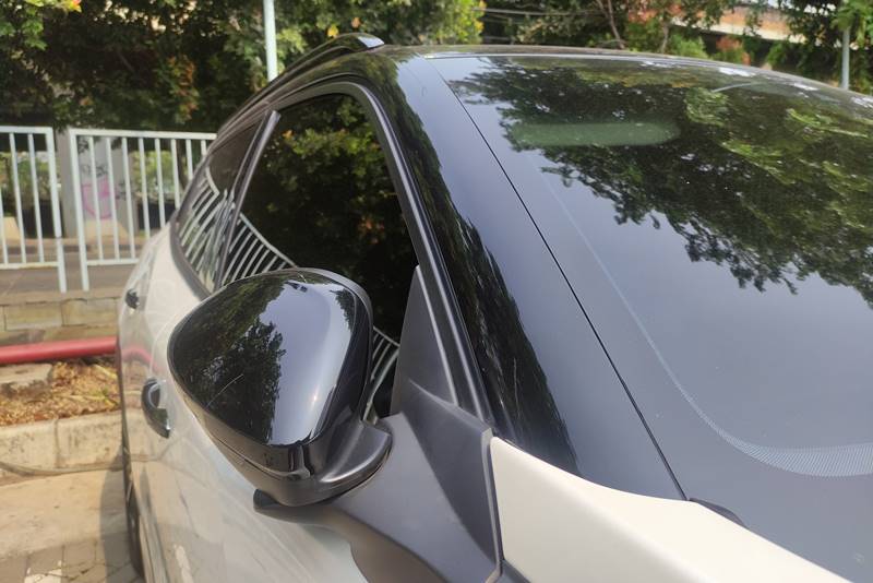 Balutan warna hitam di sematkan di berbagai sudut yang berpadu apik dengan warna putih yang mendominasi sekujur bodinya. Warna hitam dibenamkan pada atap dan pilar A.