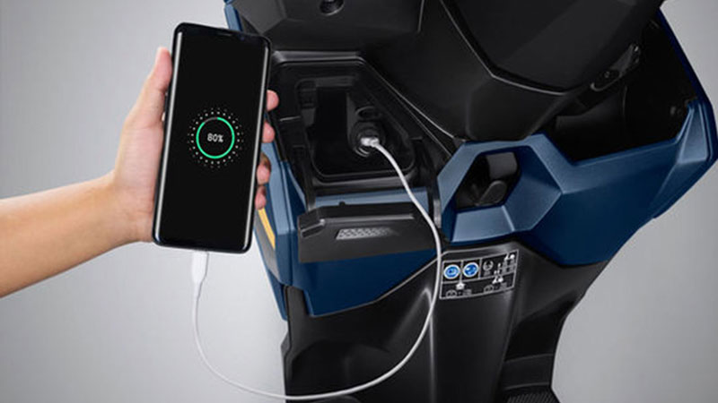 Port charger biasanya terletak di kompartemen depan atau laci bawah stang, tergantung tipe motor. Buka penutupnya, lalu pasang kabel USB yang sesuai.