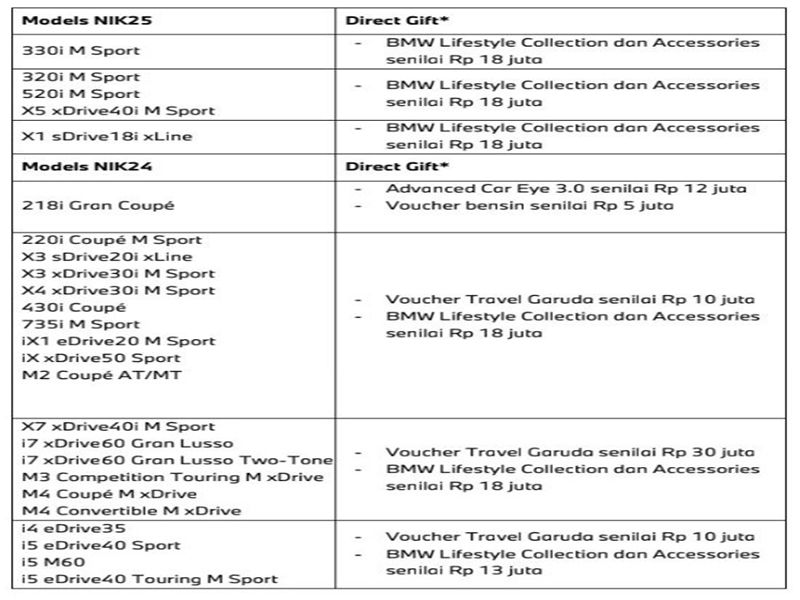 Adapun program tersebut berupa direct gift khusus diantaranya Voucher Travel Garuda Indonesia, Voucher Bensin, serta BMW Accessories & Lifestyle Collection senilai Rp18 juta.