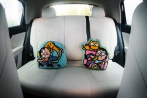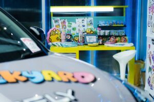 Dalam instalasi ini, Geely EX2 tampil mencolok dengan balutan warna Aurora Pink serta decal ilustratif khas Tahilalats, yang mengalir di sepanjang bodinya.