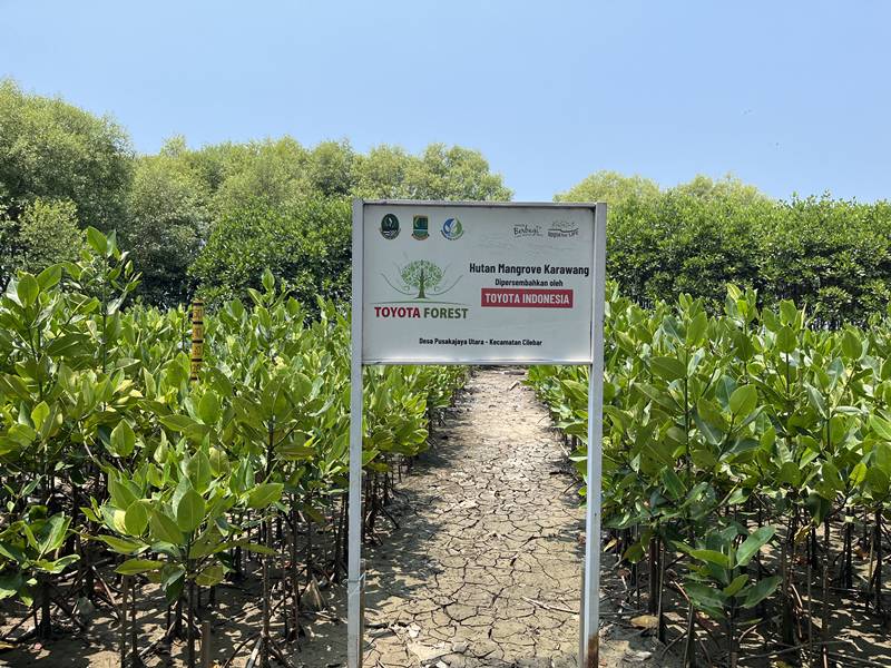 Tepatnya di Desa Pusakajaya Utara, Kecamatan Cilebar. Bersama masyarakat, TMMIN melakukan rehabilitasi mangrove, memanfaatkan limbah ban bekas sebagai alat pemecah ombak, serta mengembangkan ekonomi berbasis solusi alam (nature-based solutions).