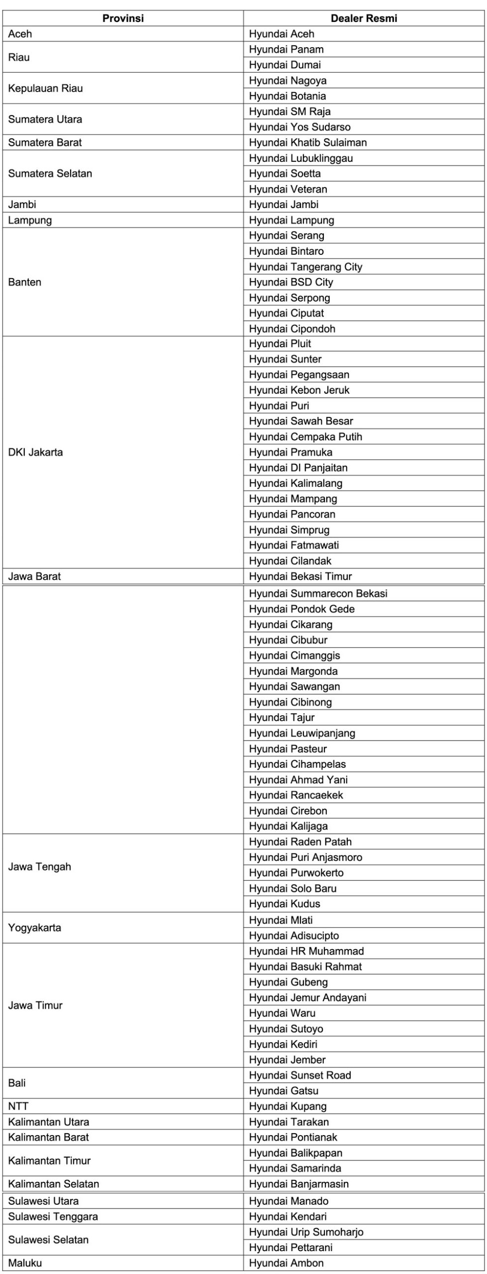 Adapun dealer yang berpartisipasi dalam Hyundai Premium Courtesy Car Program antara lain: